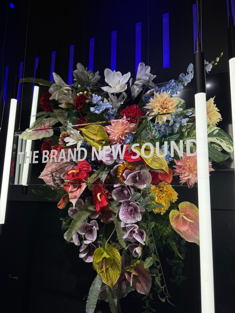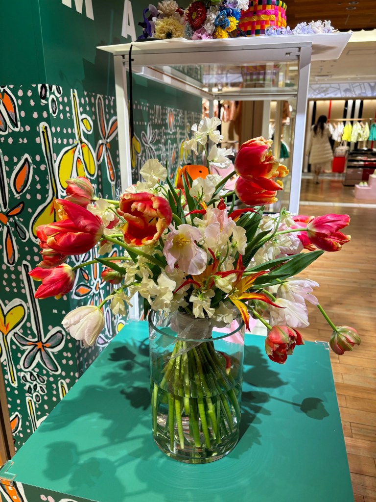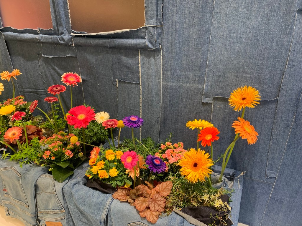 改装リニューアルイベントのデニム×フラワーコンセプトでデニム素材の力強さに負けない大輪のお花を使用してカラフルにお作りしました。