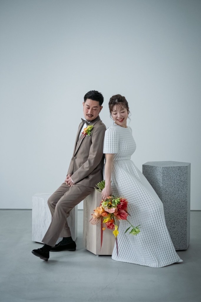祖母の好きなユリ科の植物を使用して、シンプルだけど素材にこだわったドレスをまとったお洒落なお二人に合うようなブーケをお作りさせていただきました。
