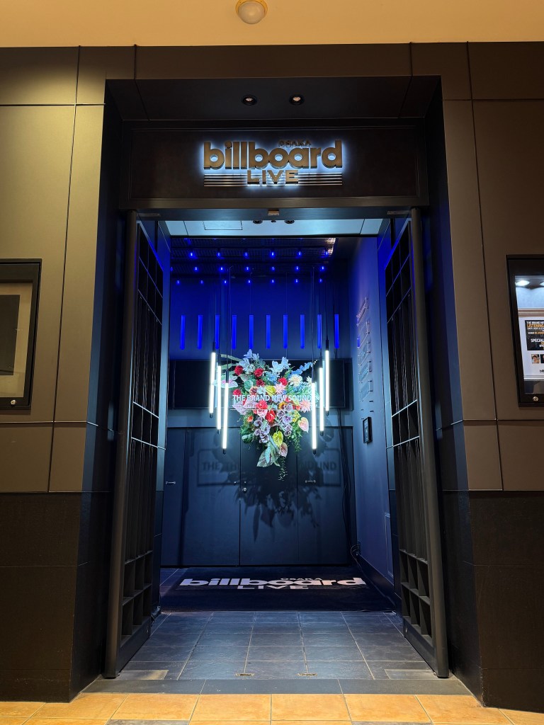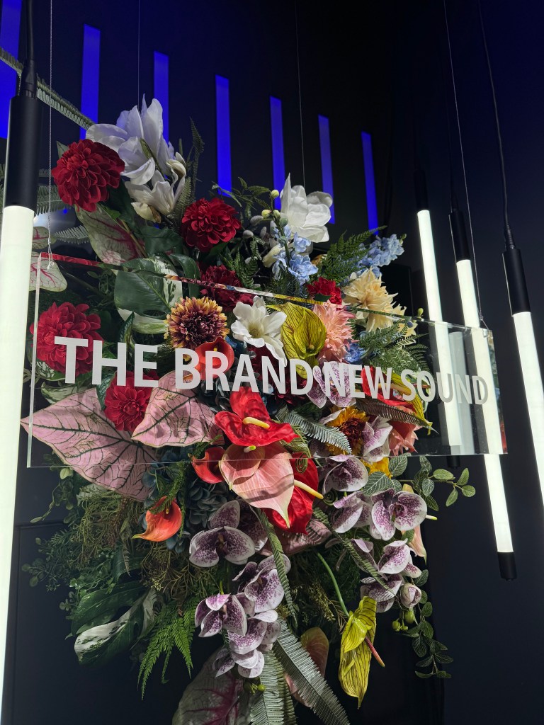 スピーカーリニューアルイベントにあわせたシンプルだけと洗練した華やかな装飾をイメージしました。元々常設の青いライトを生かした白いライトを使用して遠くからでも目立つデザインにしています。